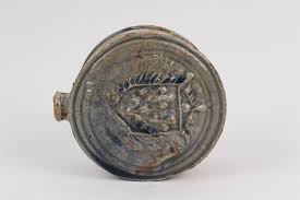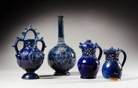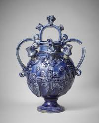 Revenons à nos bleus…..La plus grande partie de la production fut utilitaire, avec une vaisselle luxueuse et ornementée, destinée au service de la table d’une clientèle de haut rang, en cette époque au cours de laquelle le goût de la Renaissance s’affirmait, venu d’Italie. Des pièces de formes plus travaillées recevaient des décors typiques : gourdes plates ou bouteilles de mariage, carreaux de parement, décorés de blasons, masques, cordelettes, petits animaux, obtenus par moulage, gravure ou modelage à la main.